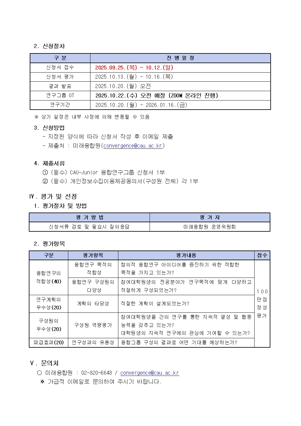 2025학년도 CAU-Junior 융합연구그룹 신청서 Category: 공지사항2025-09-29Post navigationPreviousPrevious post:에너지 시스템 공학부 문장혁 교수 연구팀, “Si 음극 소재 상온 열화 메커니즘 규명”NextNext post:2025학년도 동계계절학기 교과목 신청 및 일정 안내