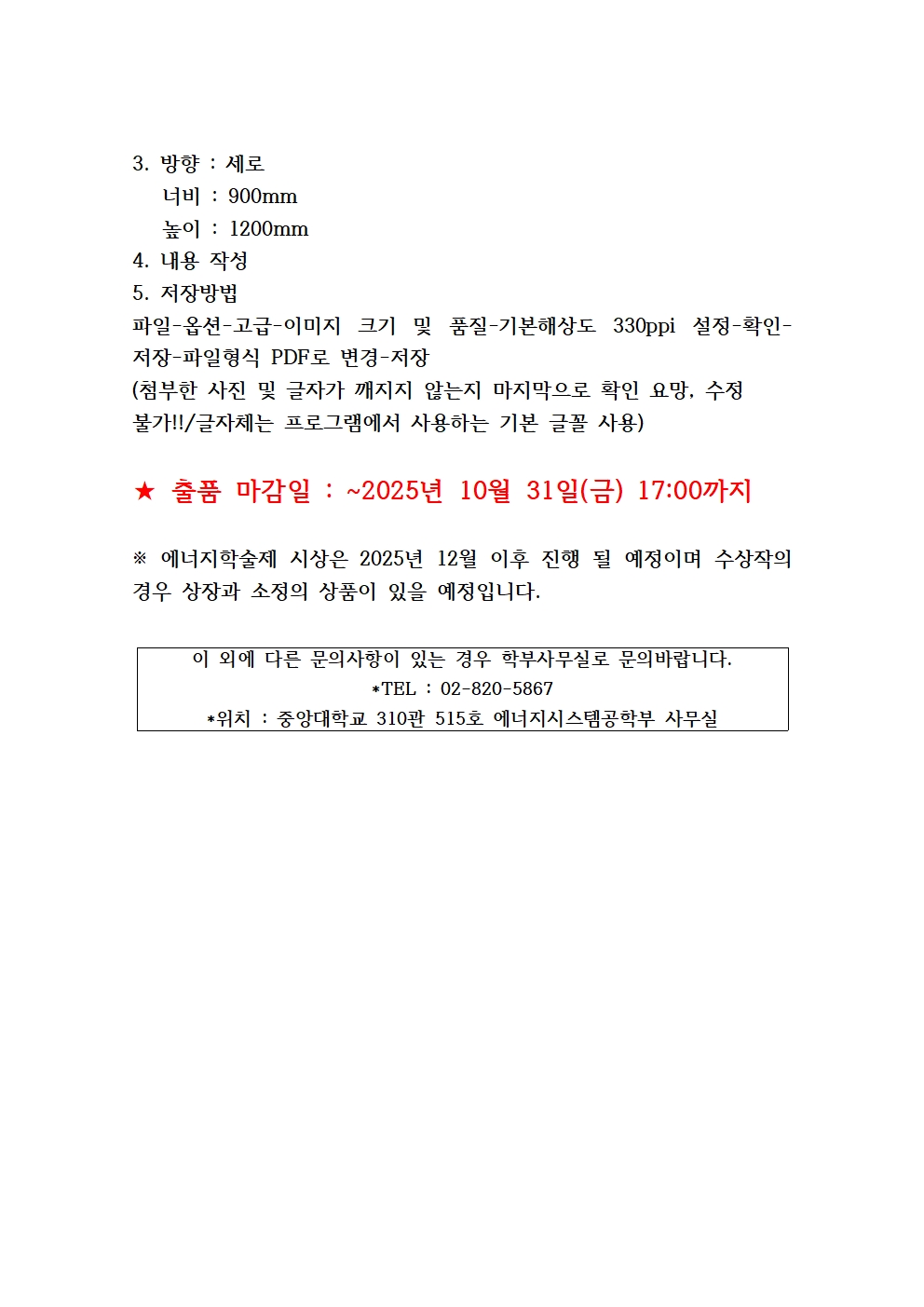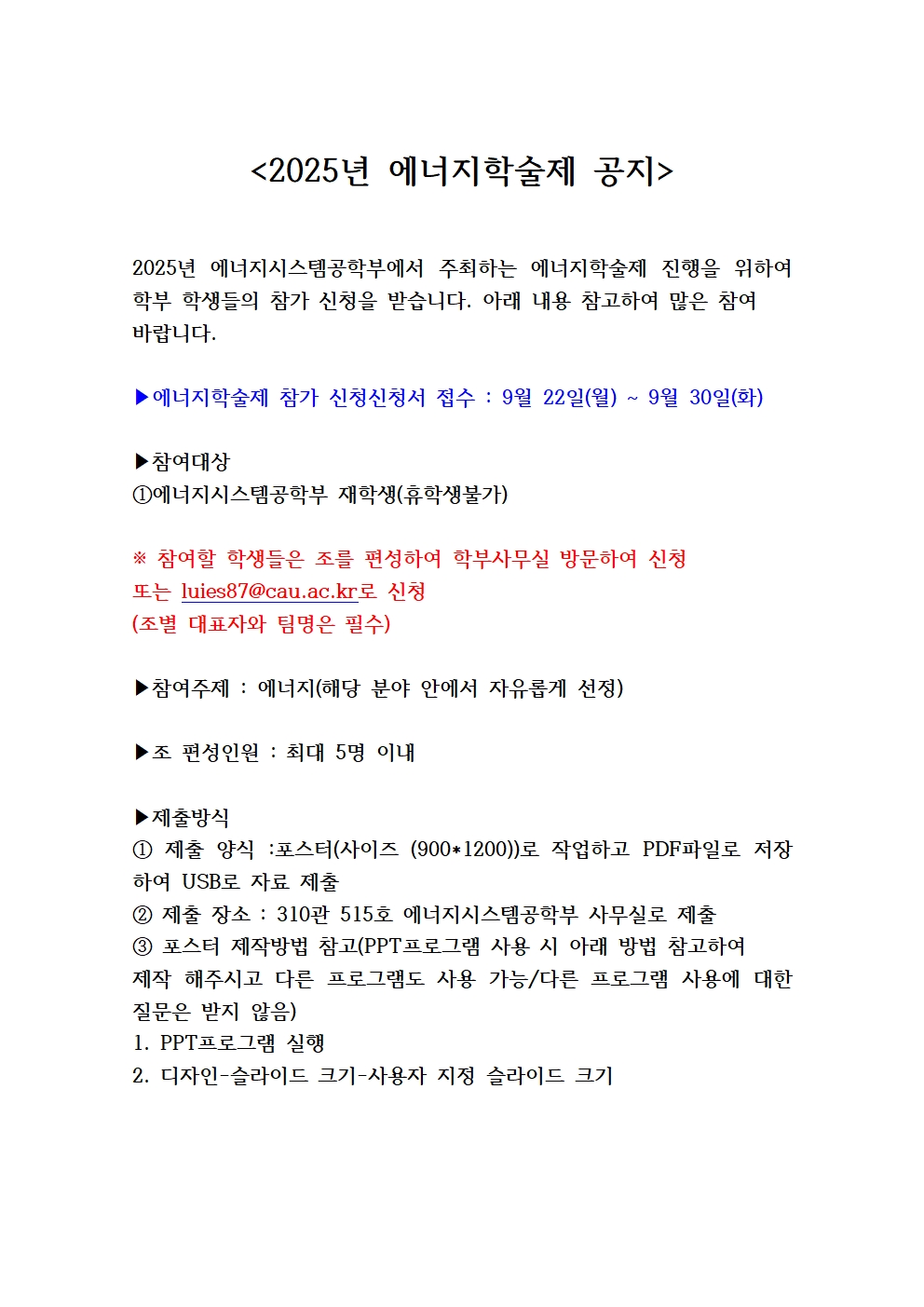 학술제신청서_에너지시스템공학부 Categories: 공지사항, 중요공지2025-09-22Post navigationPreviousPrevious post:(학부/대학원생대상)2025학년도 2학기 연구실 안전 법정교육 실시 안내NextNext post:2026 POSTECH SF AWARD(SF단편소설) 홍보