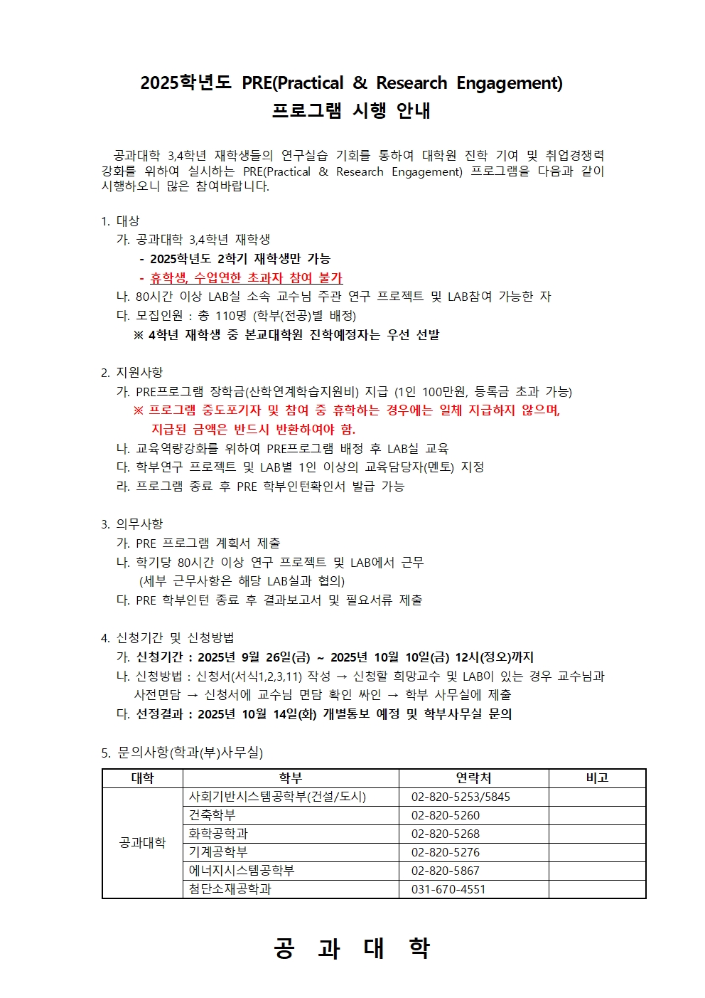 2025-PRE프로그램-서식 *신청시 모든 서류 동일한 자필서명이 들어간 원본제출 필요(본인 및 교수님, 멘토)/사본 및 스캔본은 제출 불가능합니다 *첨부파일의 작성시 유의사항과 작성가이드 참고하여 서류 작성하여 제출해주세요 Categories: 공지사항, 중요공지2025-09-25Post navigationPreviousPrevious post:제8회 핵연료물질취급자 단기과정 수강신청 안내NextNext post:에너지 시스템 공학부 문장혁 교수 연구팀, “Si 음극 소재 상온 열화 메커니즘 규명”