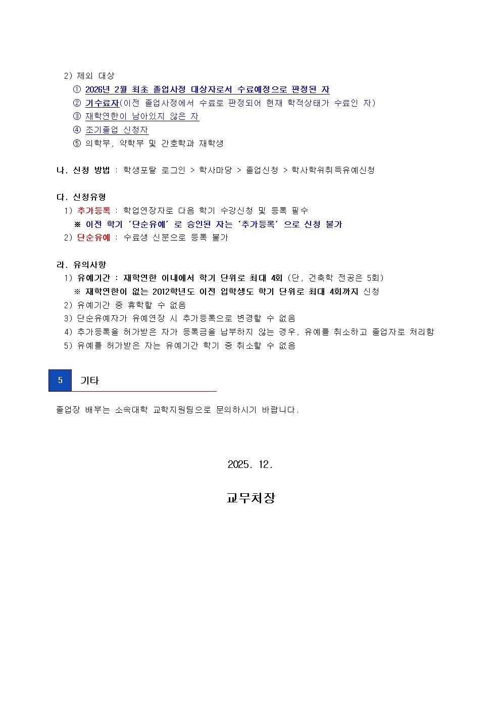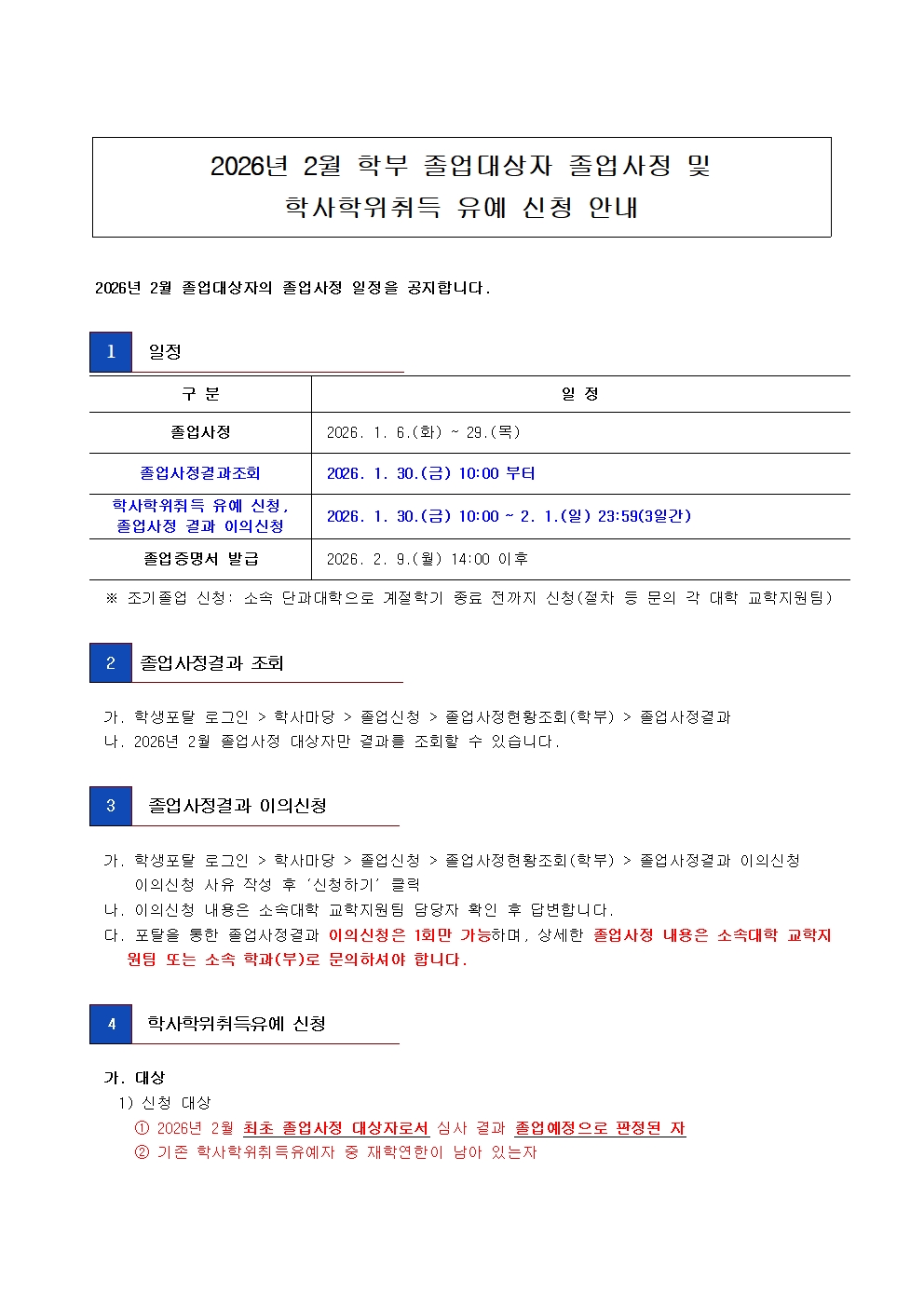 2026년 2월 학부 졸업대상자 졸업 사정 및 학사학위취득 유예 신청 안내