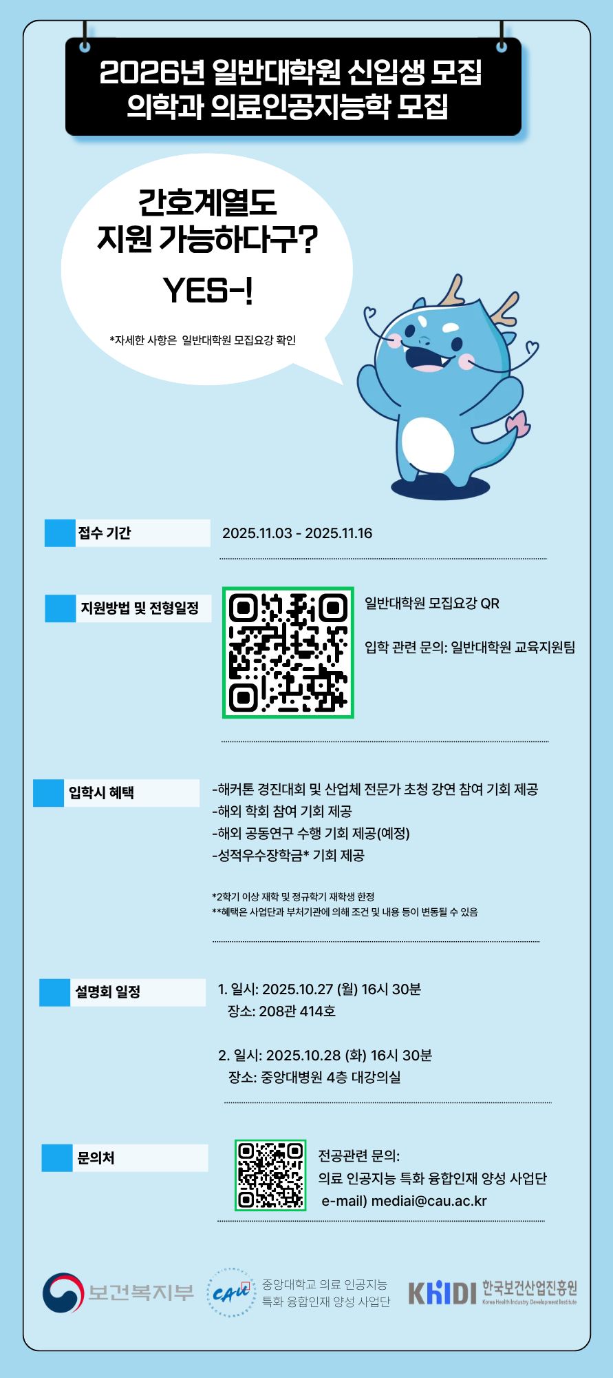 Category: 공지사항2025-10-23Post navigationPreviousPrevious post:2025 중앙대학교 대학원 페어 안내NextNext post:2025 중앙대학교 CAU 공학학술제